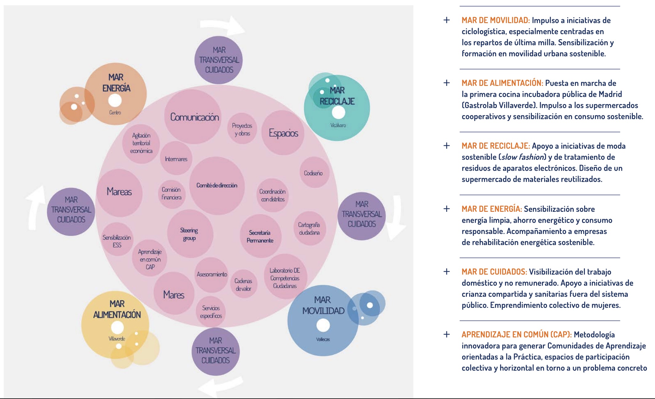 Para ello se centra en cinco sectores diferentes en cuatro distritos de la ciudad de Madrid: movilidad en Vallecas, alimentación en Villaverde, reciclaje en Vicálvaro y energía en Centro. El quinto sector, que atravesará todos los distritos, es el sector de los cuidados que, al igual que la economía social y solidaria, pone en el centro el mantenimiento y la sostenibilidad de la vida. En cada uno de los cuatro distritos se va a contar con un espacio dedicado al proyecto, denominado MAR, que servirá de laboratorio de conocimiento y albergará estas nuevas iniciativas productivas. Se trata de edificios y espacios públicos que estaban en desuso, y se van a habilitar y a poner a disposición de la ciudadanía.